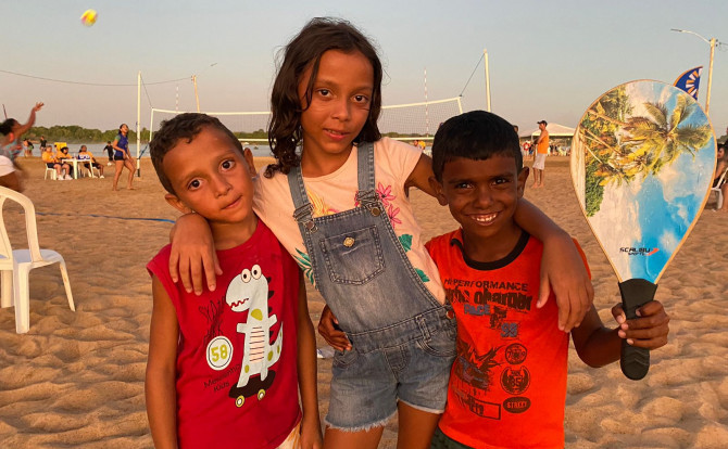 No fim de semana, a criançada também aproveitou as oficinas de iniciação esportiva que serão desenvolvidas ao longo do projeto. A Gianna Emanuela, de 10 anos, se divertiu muito com o irmão Marcos Gabriel e o primo Marcos Vinicius, e também com os novos amigos que fizeram durante as atividades. “Eu vim para a praia de Pau D’Arco e sou de Araguaína. Eu joguei vôlei e beach tennis. Eu gostei muito, amei”, afirmou.