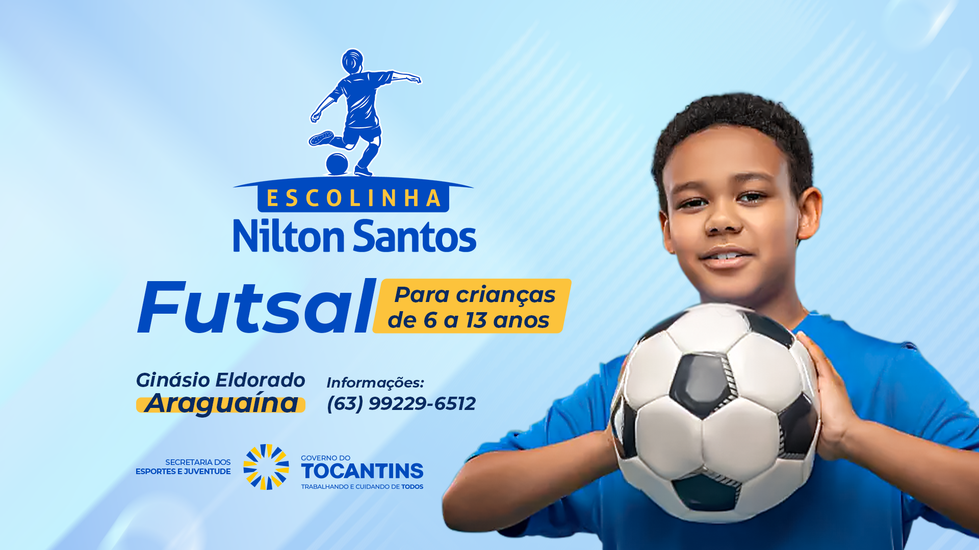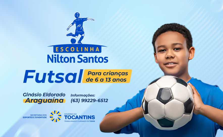 O Governo do Tocantins, por meio da Secretaria dos Esportes e Juventude, abre vagas para a Escolinha Nilton Santos, na modalidade de futsal. O projeto será desenvolvido no ginásio Eldorado, em Araguaína, na região norte do Estado. Podem participar crianças e adolescentes de 6 a 13 anos.